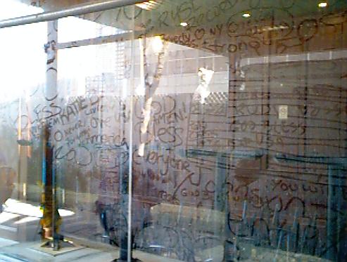 There was an awed and deeply shocked silence among the onlookers. Some people were praying or kept a solemn silence while pondering the enormity of it all. Police and private security personnel were guarding the site. Nobody, literally nobody, was trying to get closer, pass the barrier or take a "souvenir". People had written and drawn things in the dusty windows surrounding Ground Zero. The pictures ranged from the United States flag to bunches of flowers. The texts contained prayers, but also expressed the anger of the writer with these gruesome attacks.
