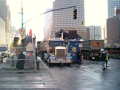 A large perimeter fence had been erected around the entire complex, but you could get close enough to get a good view of the carnage. From afar, the completely burned out skeleton of one of the smaller office buildings next to the former twin towers could be seen. Closer, the view simply defied description. Large cranes were tearing down the remains of office buildings, construction workers were stepping among the rubble where the remains of over 4,000 men, women and children were still buried. Occasionally, a body was recovered from the site, the day before yesterday marking the 559th body that was found in this incredible heap of metal and concrete.