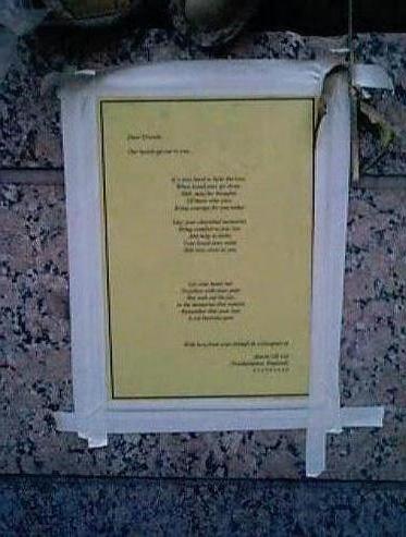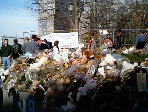 Round the corner you reach the former entrance of the WTC grounds. A sea of flowers, notes, poems, pictures and teddy bears stretched as far as my eyes could see. A big banner proclaimed the eternal gratitude of American Airlines flight attendants towards the FDNY and NYPD. People from all over made their grief materialise in this place. Obituaries lined the fence. Lovers, fathers, mothers, brothers, sisters, children and friends proclaimed their everlasting love to the deceased and missing. Pictures of the victims, beautiful in their happiness, could be seen all over the place. Prayers and poems spoke of the great loss to all mankind that had happened here.